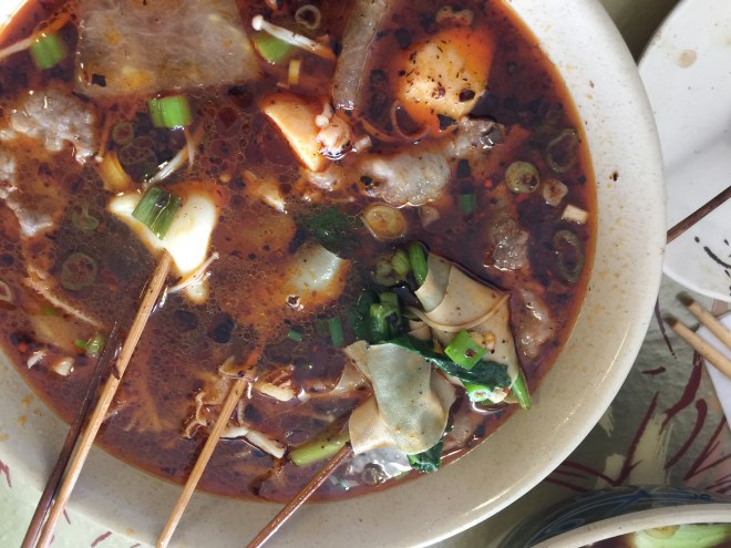 串燒店最常搭的就是【麻辣燙】,這家京味的麻辣燙$5,碗大概就巴掌大,每一份食材一兩口的份量,還可以跟桃爸對分,算是物美價廉。老闆娘見我們帶了三個小食客,意外地親切和藹,對我們「加個空碗、串燒不加辣」這種無理要求都和顏悅色,讓很怕聽不懂陸陸腔的桃爸很安心。以麻辣燙的湯底而言,桃媽喜歡這家的味道,很接近十年前在金華街吃到麻辣燙風味。