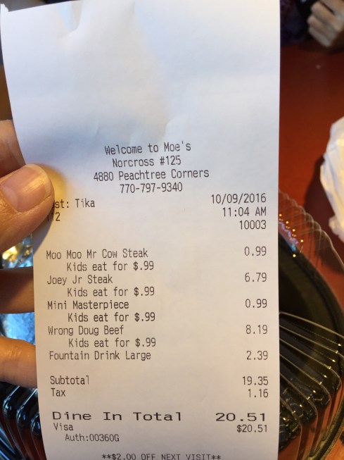 今天我們去的是位在peachtree corner 的the forum 購物中心的Moe’s,每個禮拜日 kids eat for $.99.