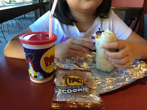 CP值最高屬中間這位「Moo Moo Mr. Cow」,kids size burritos 青菜乳酪任你加,別忘了點最貴的牛排增加蛋白質來源。右邊這位power wagon只是把tortilla 餅皮對折,形狀不同,通常叫Taco. 想吃炸的餅皮,就是選Taco。我們考慮Moe’s 總是送一大包 tortilla chips,孩子老是狂吃,身上自由基亂竄,容易發炎過敏。主餐就不應該再炸下去了。