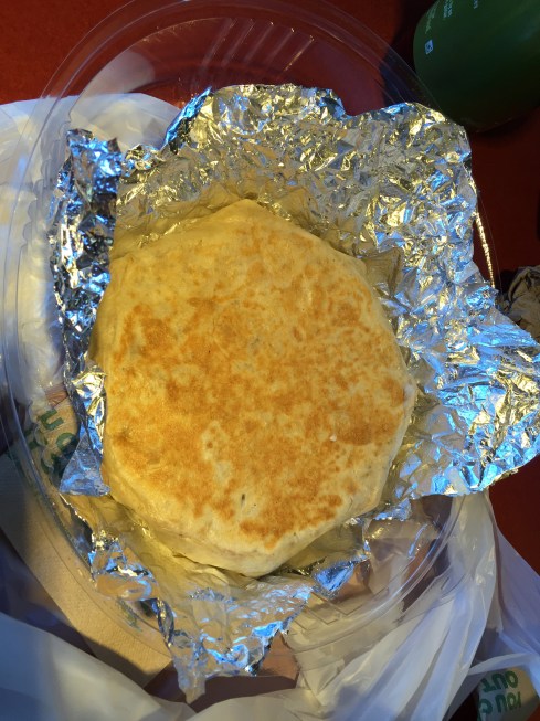 大人份的小麥餅皮疊上小張玉米餅皮,再放上喜歡的內容物,最後再加上一張玉米皮和乳酪。摺八折後放上爐灶煎烤。每一口都吃得到乳酪香、餅皮脆和新鮮蔬菜的交流。