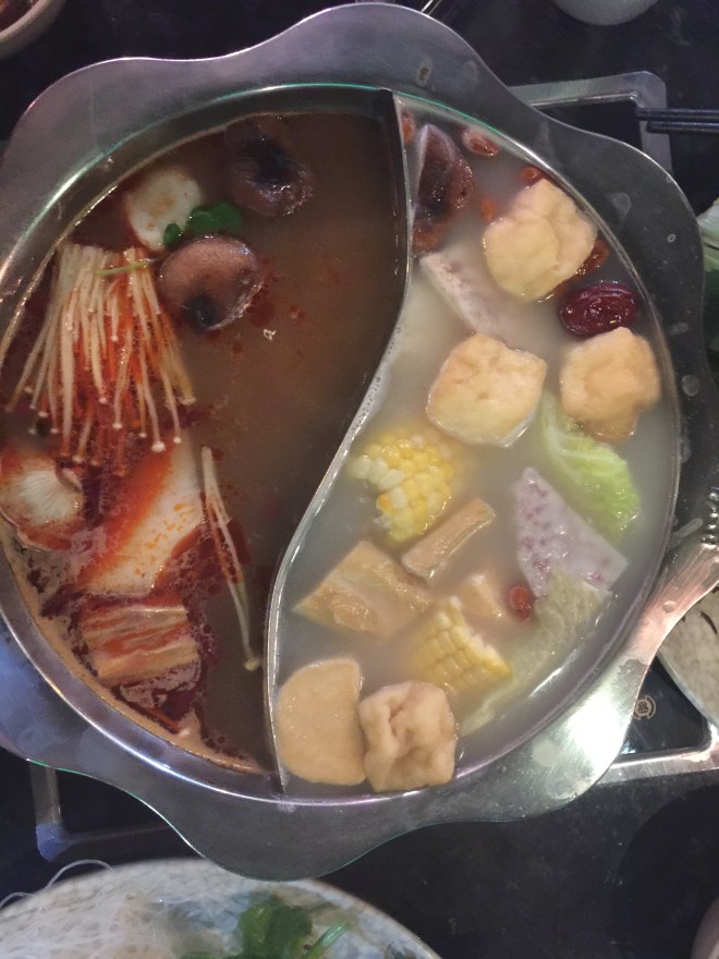 爸媽和五歲老三合吃鴛鴦鍋 (不夠辣的麻辣和養生鍋)