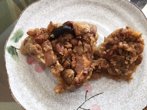 梨梨吃完讚美說:媽媽,這個米飯好軟。我告訴她這是南部粽的作法。餡料分開滷製或炒熟後,再裝進調味好的長糯米裡面,包成金字塔pyrimid的形狀(順便複習她二年級數學Geometry),用棉線綁實後,再成串丟入大鍋,呼嚕呼嚕大火煮熟!因此,米飯部份有沒有熟,要靠經驗控制時間和火候。有時候一次放太多下鍋,就會發生米心未透的悲劇,聽說是無法挽救的哀戚。偏愛米粒晶瑩剔透,粒粒皆辛苦的人,就會偏愛北部粽,因為是炒熟的油飯用粽葉包裹起來。